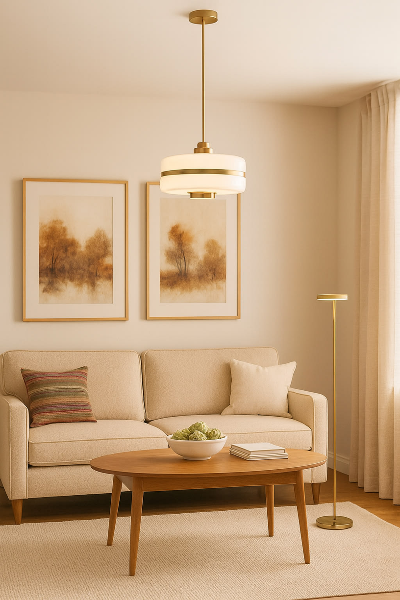 Dreamy warm‑modern kitchen vibes with brass, marble, and soft globe lighting.